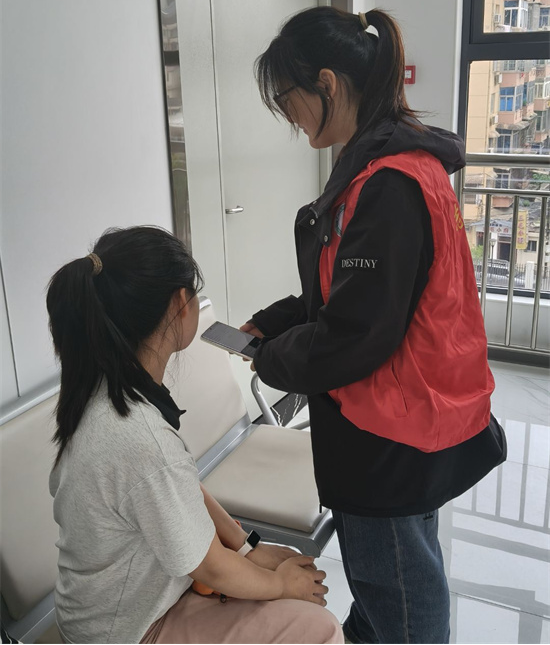 在一楼大厅,志愿者们耐心为患者指引科室方向,细答就诊路线疑问;在四楼服务区域,他们协助患者及其家属完成挂号、取号,为就医流程“减时提速”,用高效服务缓解患者候诊焦躁。面对行动不便的患者,无论是老人还是被家长牵着的孩童,志愿者都第一时间上前询问并帮助,全程陪同,以贴心举动化解不便;针对初次就诊者,他们用通俗语言详细讲解流程与注意事项,让就医过程温馨有序……原本忙碌的医院,因志愿者的到来添加了长久的暖意。