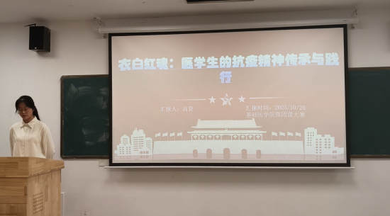 口腔A2512班肖萱以“白衣红魂:医学生的抗疫精神传承与践行”为题带来微团课。她通过回顾疫情期间青年医生挺身而出、坚守岗位的感人事迹,生动诠释了医学专业使命与红色精神相融合的奉献本色。肖萱提出,我们医学生应让抗疫精神落地生根,响应“健康中国2030”战略,以白衣为甲、红魂为核,在服务人民健康、夯实基层医疗技术的进程中贡献青春力量。